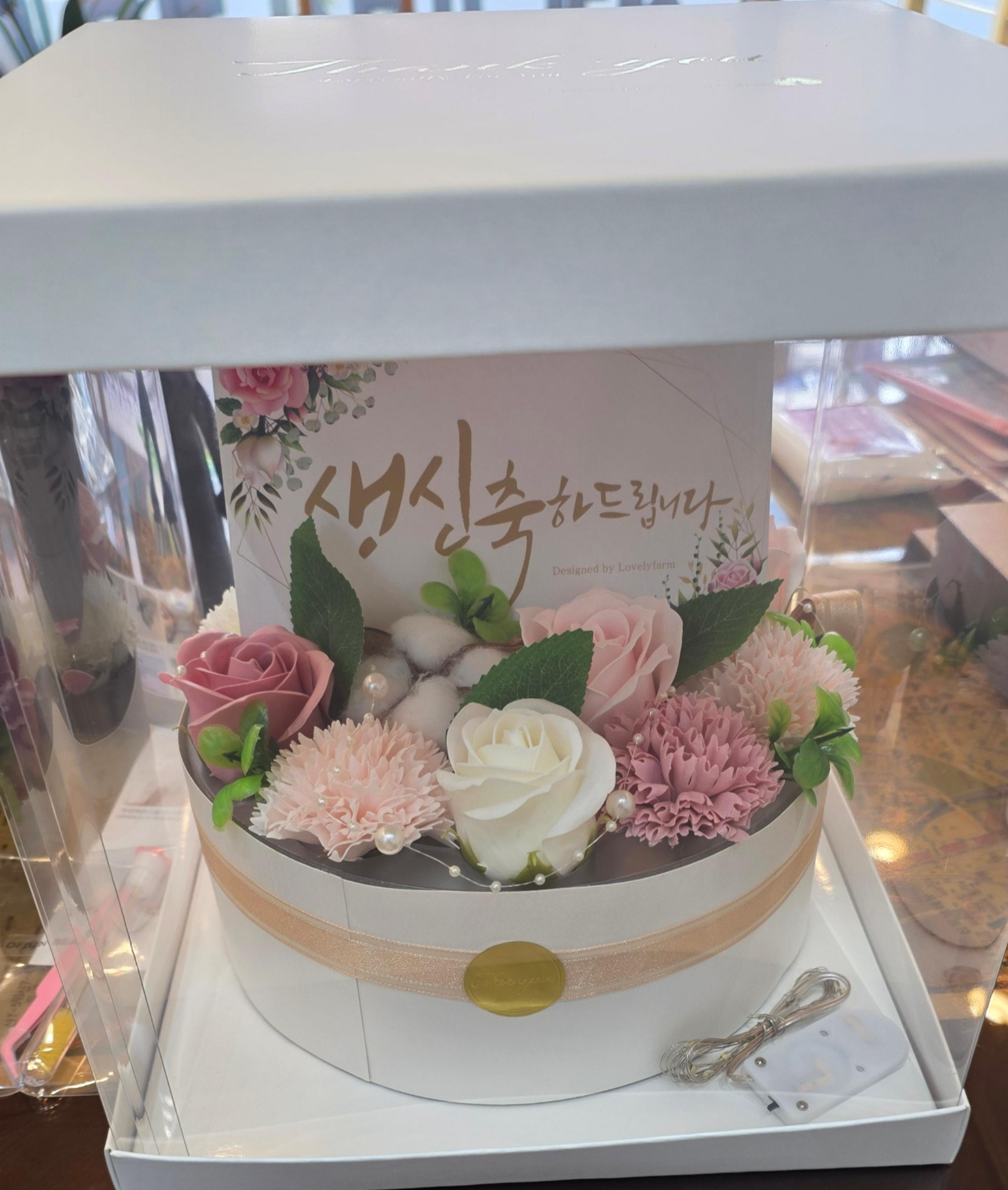 꽃 컬러도 핑크, 아이보리 계열로 은은해서 팔순 같은 가족행사에 잘 어울렸고, 너무 화려하기보다는 고급스럽고 부드러운 느낌이 들어 좋았어요. 박스까지 화이트 톤이라 완성했을 때 훨씬 깔끔해 보이는 것 같아요.