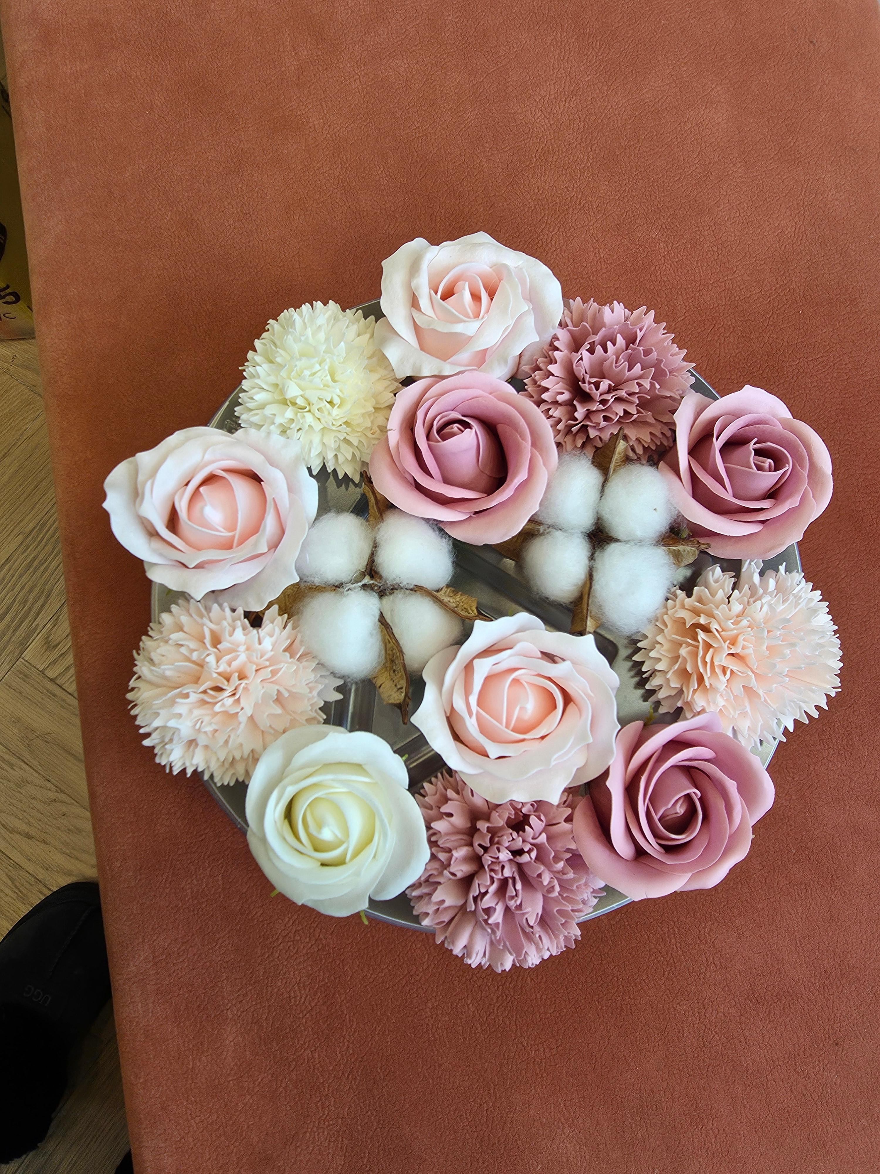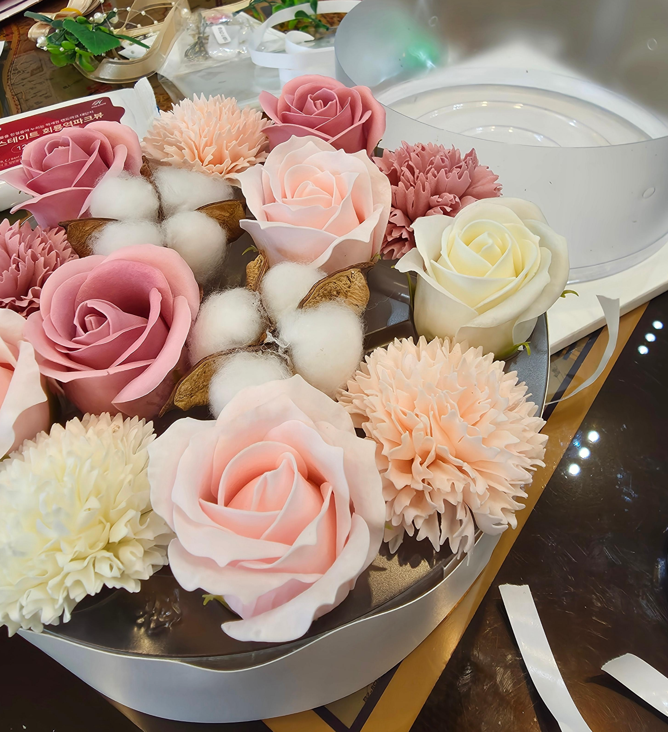 장미꽃, 카네이션 느낌의 꽃, 목화 장식이 섞이니까 생각보다 훨씬 풍성하고 고급스럽게 보이더라고요.